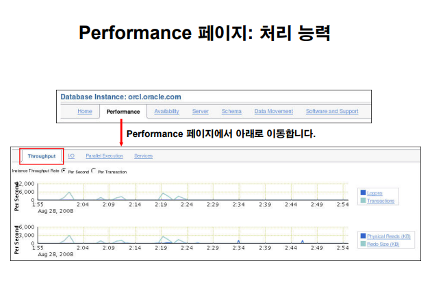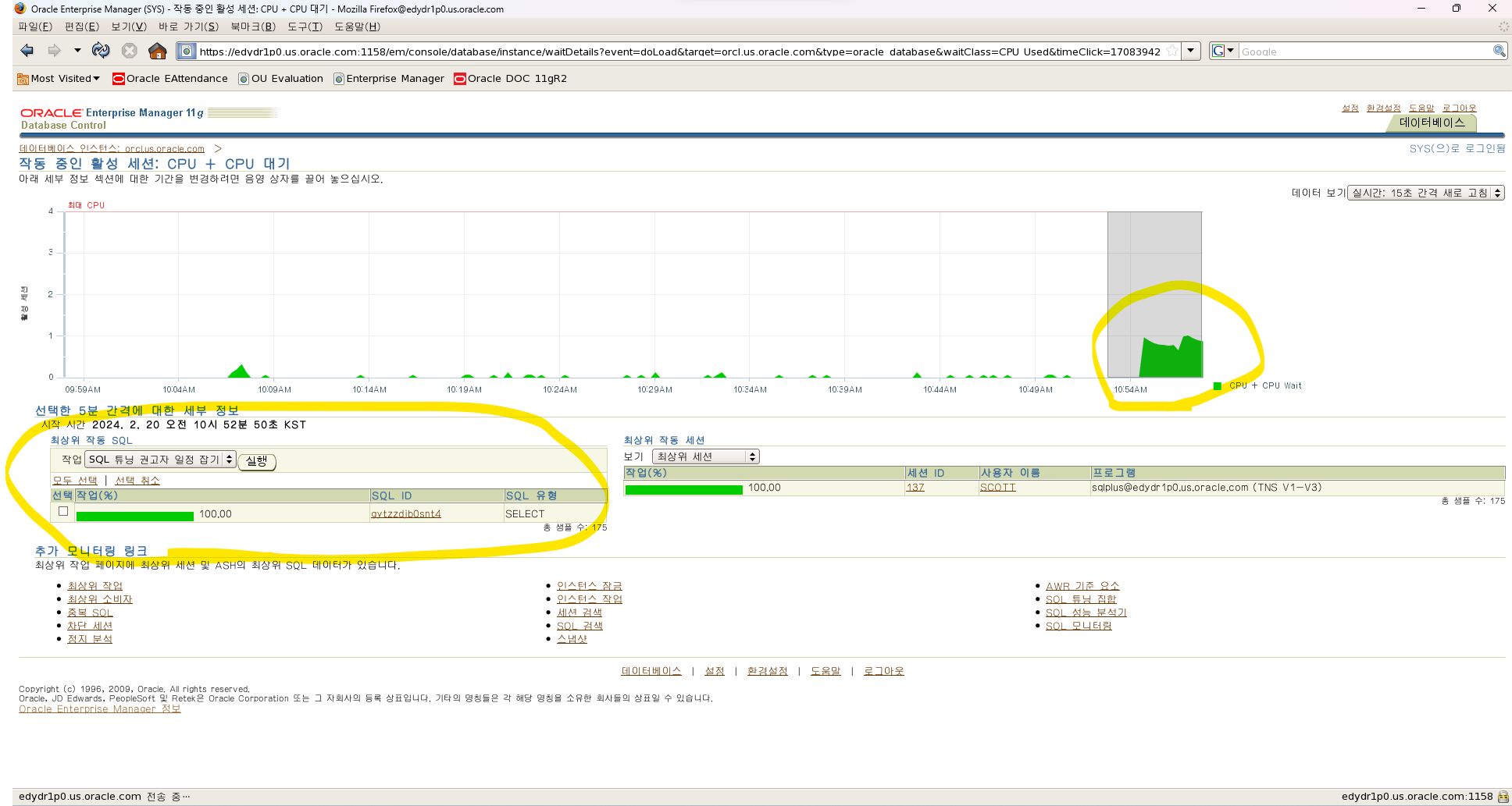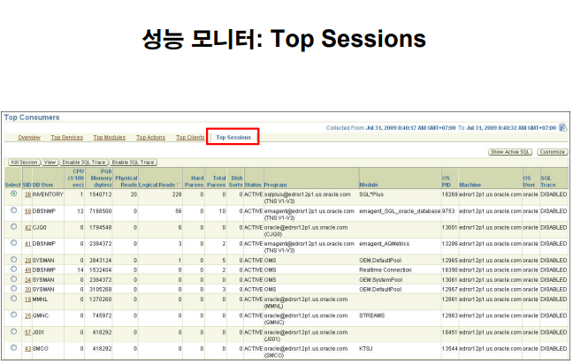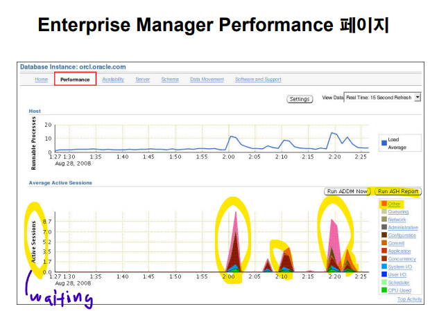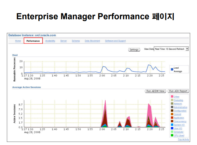 문제 파악을 빠르게 하려면 EM 의 성능 모니터 탭을 이용하면 아주 빠르게 문제를 파악할 수 있습니다.