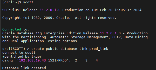 #2. orcl 쪽 scott 유져에서 prod 쪽에 대한 db 링크를 생성합니다.