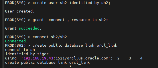PROD(SYS) > grant create database link to sh2;