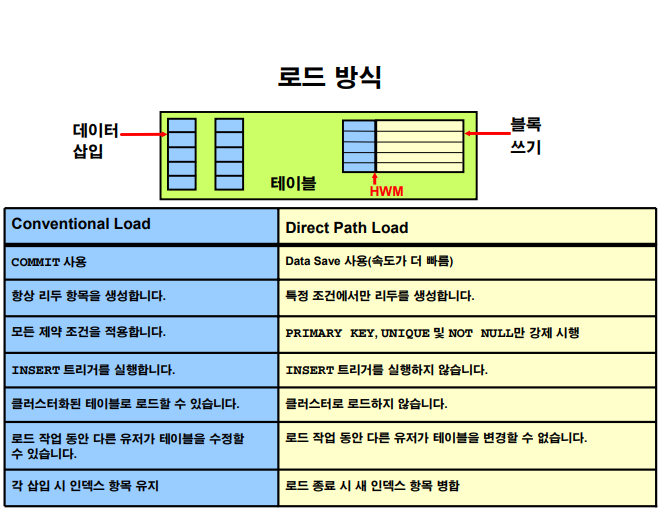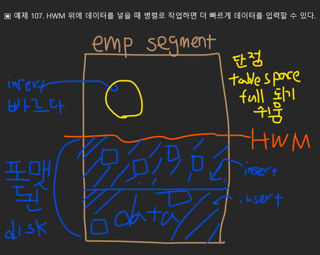 HWM 위에는 포맷되지 않은 디스크가 있고 인서트가 빠름 대신 단점으로 테이블 스페이스가 full 되기 쉽다