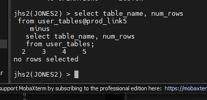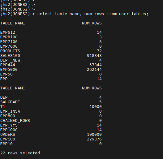 jones2> select table_name, num_rows from user_tables;