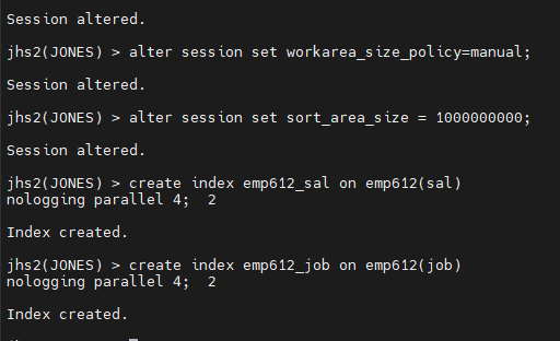 jhs2(JONES) > alter index emp612_sal parallel 1;