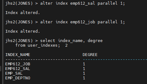 jhs2(JONES) > alter index emp612_job parallel 1;