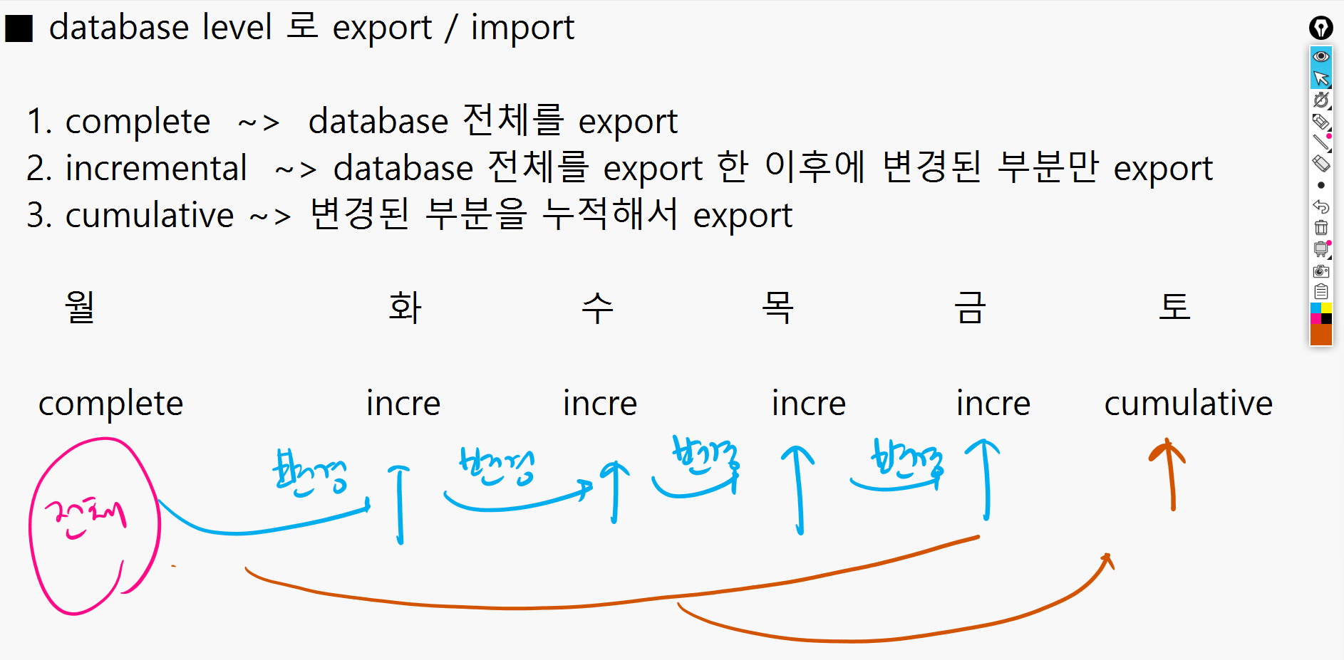 incremental -> database 전체를 export 한 이후에 변경된 부분만 export