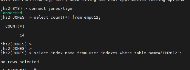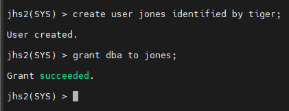 jhs2(SYS) > create user jones2 identified by tiger;