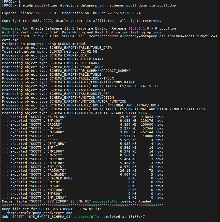 #1. PROD 쪽에서 scott 에 가지고 있는 모든 객체를 유져 레벨로 export pumpt 합니다.