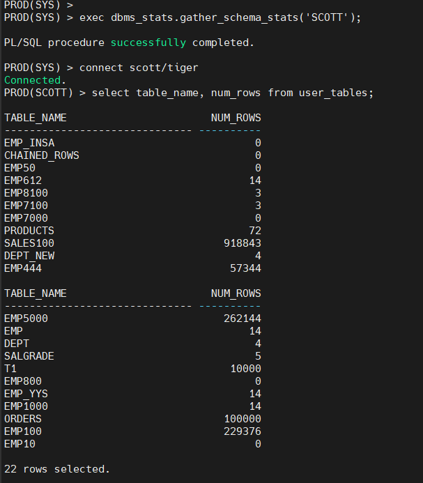 exec dbms_stats.gather_schema_stats('SCOTT');