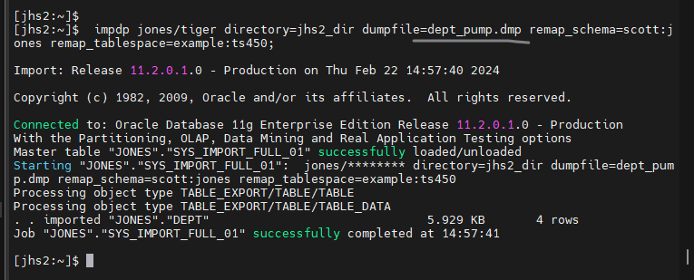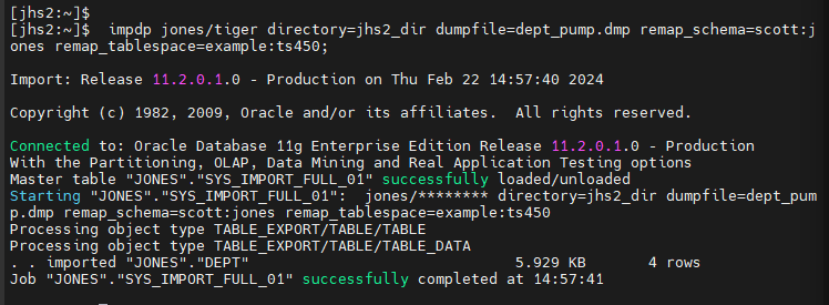 $ impdp jones/tiger directory=jhs2_dir dumpfile=dept_pump.dmp remap_schema=scott:jones remap_tablespace=example:ts450;