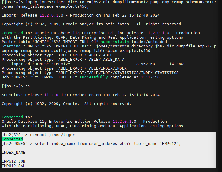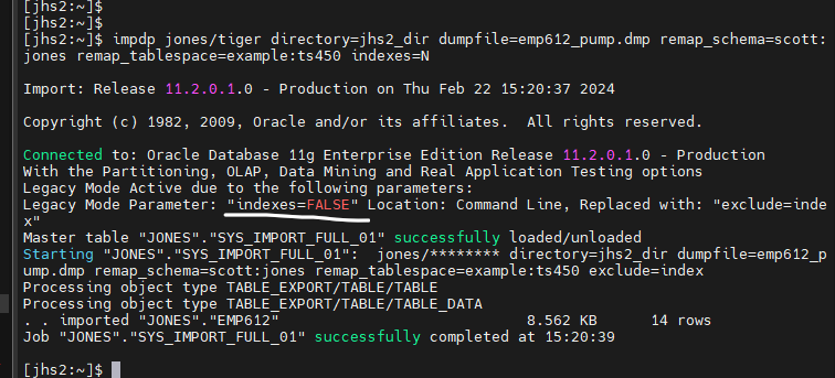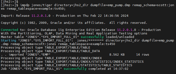 $ impdp jones/tiger directory=jhs2_dir dumpfile=emp_pump.dmp remap_schema=scott:jones remap_tablespace=example:ts450;