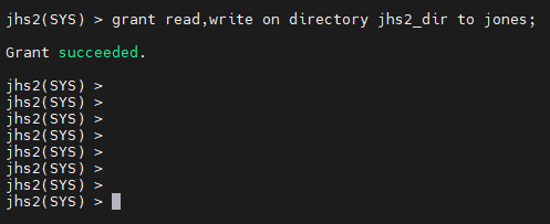 jhs2(SYS) > grant read,write on directory jhs2_dir to jones;