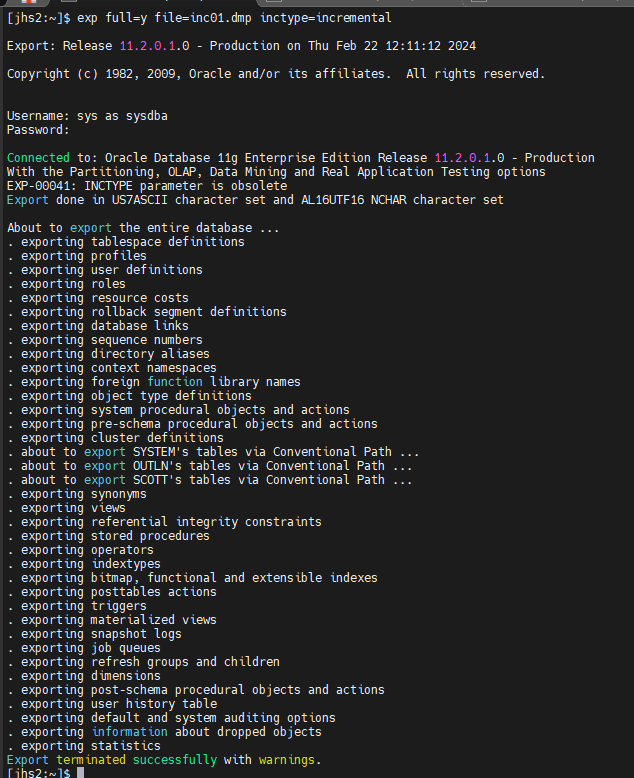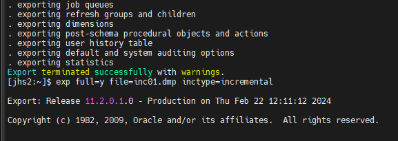 $ exp full=y file=inc01.dmp inctype=incremental