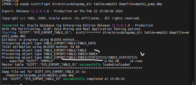 $ expdp scott/tiger directory=datapump_dir tables=emp612 dumpfile=emp612_pump.dmp