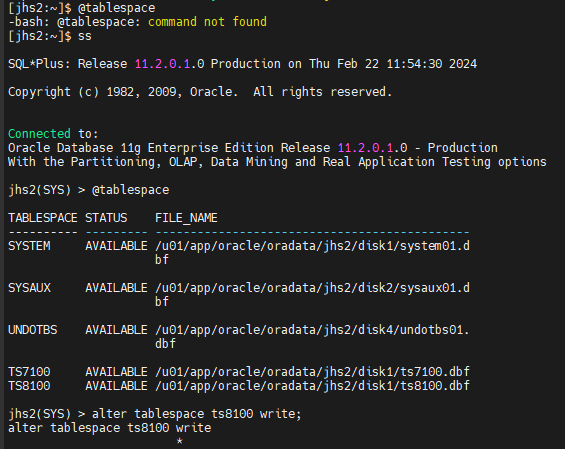 jhs2(SYS) > create tablespace ts450 datafile '/home/oracle/ts450.dbf' size 100m;
