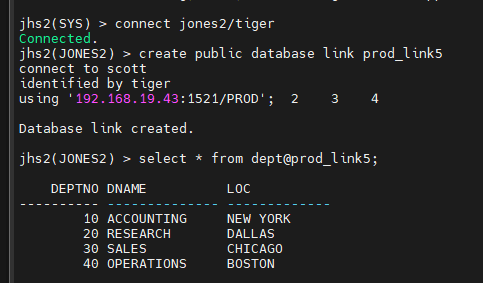 jhs2(JONES2) > create public database link prod_link5