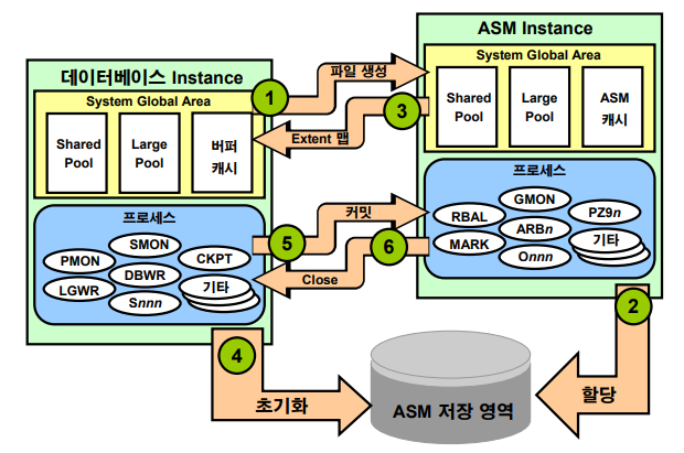 ASM 인스턴스의 역할은 ASM 영역을 관리하기 위한 백그라운드 프로세서와 메모리가 있는 영역으로 이 인스턴스가 있어야 raid 0+1 의 효과도 누릴 수 있고 asm 의 장점을 누릴 수 있습니다.
