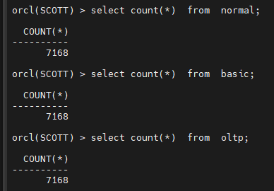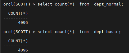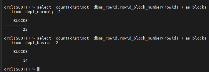 문제1. 이번에는 dept 테이블에 대해서 아래와 같이 테이블을 생성하고 압축 테이블이 더 공간을 적게 사용하는지 확인하시오