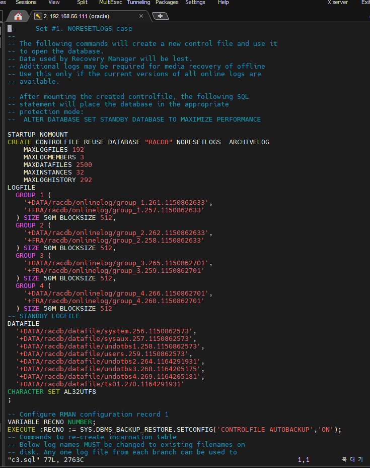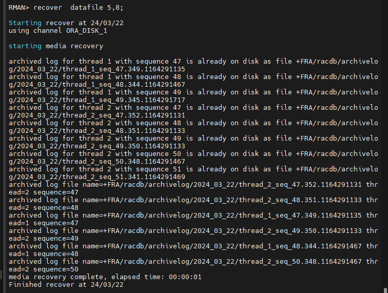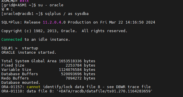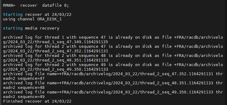 RAC 환경에서 복구는 한쪽노드에서만 진행해야 합니다.