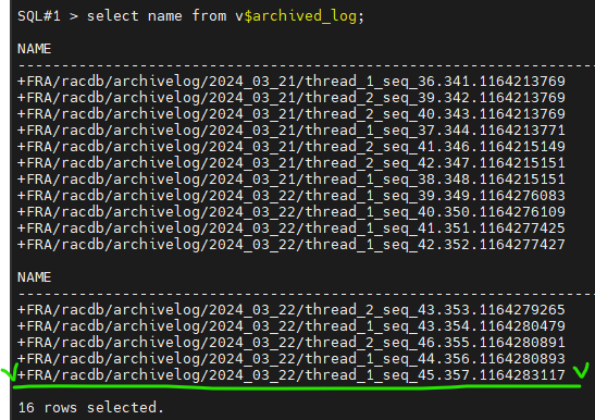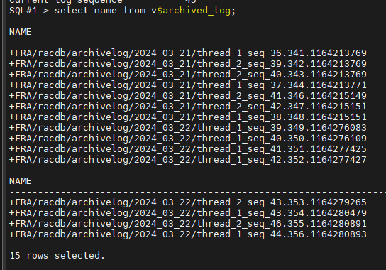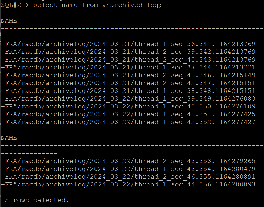 SQL#1> select name from v$archived_log;