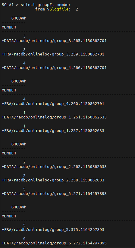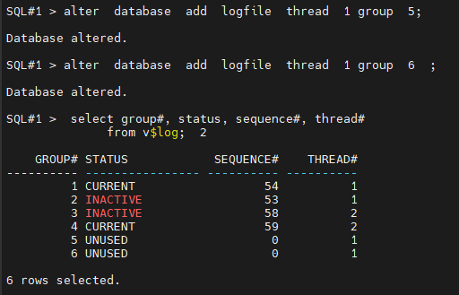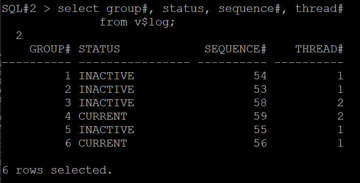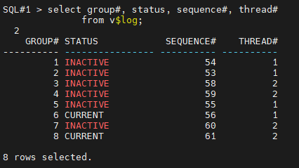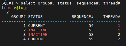SQL#1> select group#, status, sequence#, thread#
