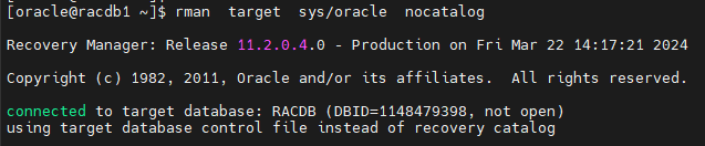 $ rman target sys/oracle nocatalog