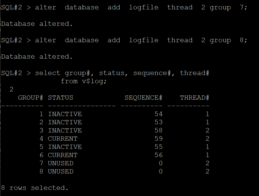 SQL#2> alter database add logfile thread 2 group 8;