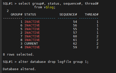 SQL#1 > alter database drop logfile thread 1 group 5;