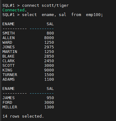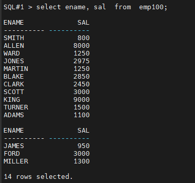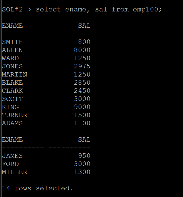 SQL#2> select ename, sal from emp100;