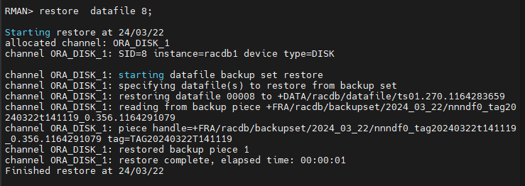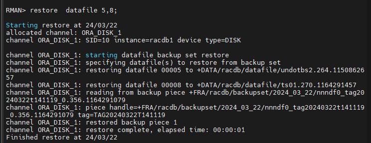 RMAN> restore datafile 5,8;