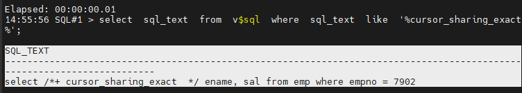 SQL#1> select /+ cursor_sharing_exact / ename, sal from emp where empno = 7902;