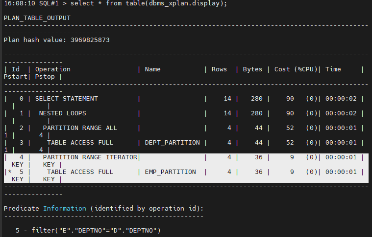실행계획에 key 가 출력되는데 key 기반으로 필요한 파티션에 대해서만 접급해서 파티션 와이즈 조인을 했습니다.