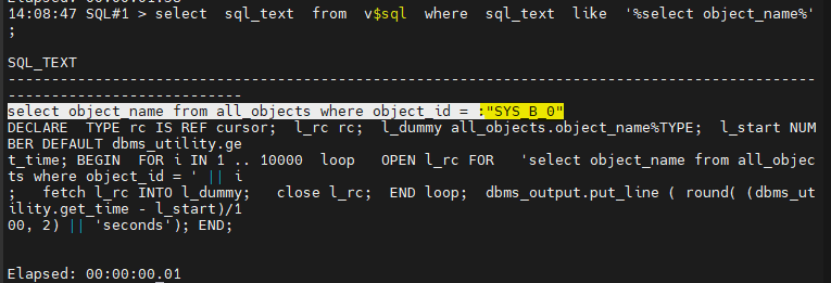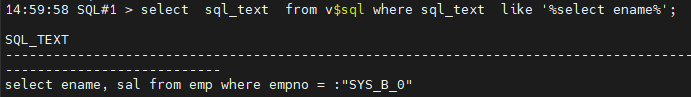 SQL#1> select sql_text from v$sql where sql_text like '%select ename%';