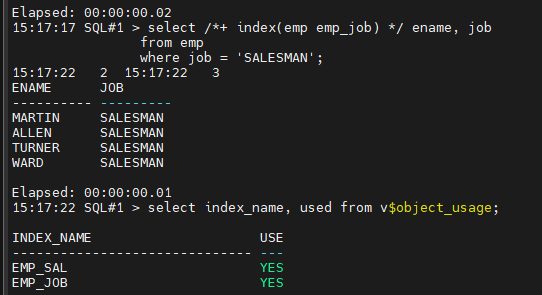 SQL#1> select /+ index(emp emp_sal) / ename, sal