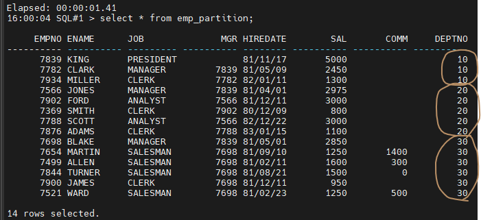 #1. emp 테이블을 부서번호를 기준으로 파티션 테이블로 구성합니다.