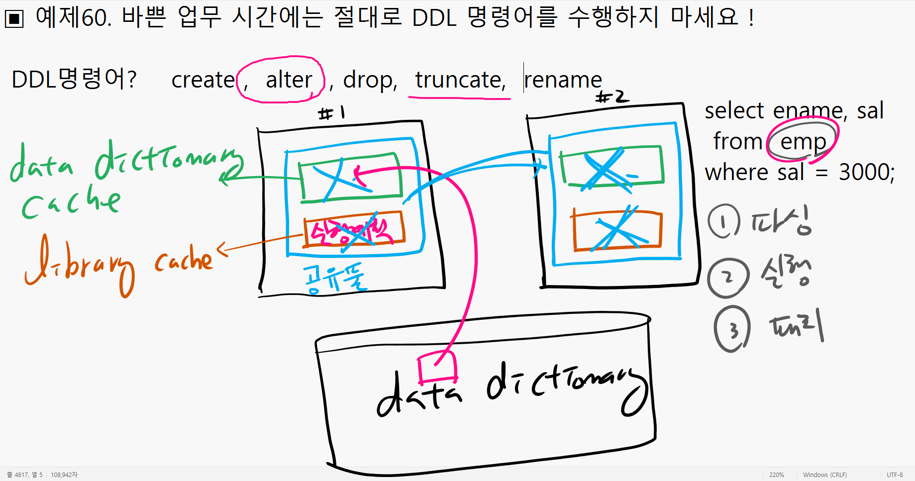 설명: 바쁜 업무시간에 DDL 문을 실행하게 되면 DDL명령어와 관련된 테이블에 대한 파싱정보가 공유풀에서 사라지게 됩니다. 그러면 다시 파싱을 해야하므로 관련된 테이블을 SELECT 하는 모든 쿼리문이 다같이 느려지게 됩니다. 그래서 컬럼 추가와 같은 DDL 명령어는 업무시간 피해서 수행해야합니다.