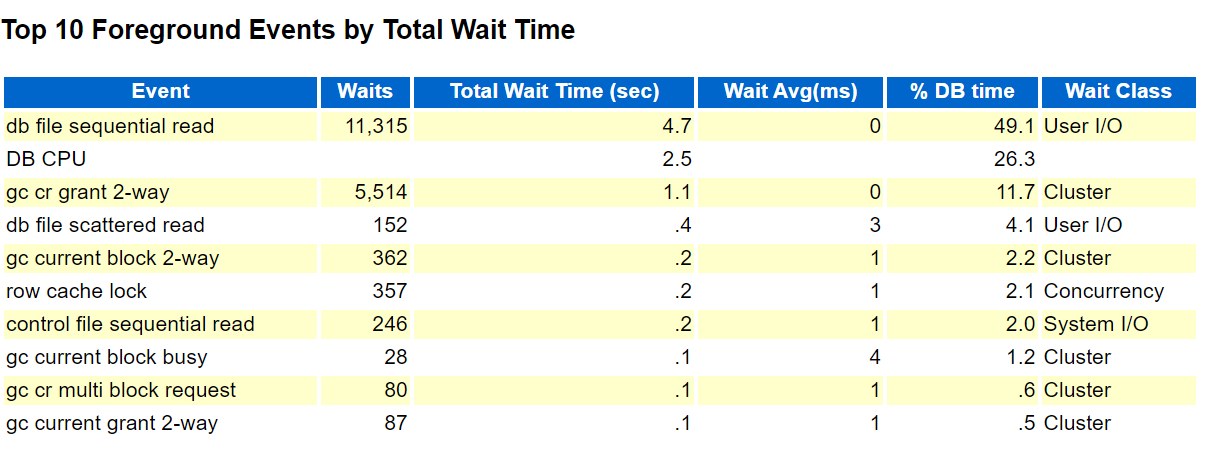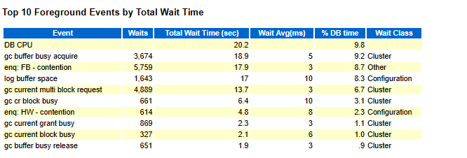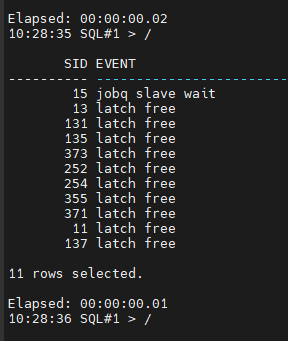 설명: latch free 대기 이벤트가 나오고 있습니다. 이 대기 이벤트는 buffer cache 쪽에 관련한 대기 이벤트입니다. 이 경우의 해결방법은 latch free 경합을 일으키는 SQL 을 찾아서 튜닝하는 방법으로 해결을 하면 됩니다.