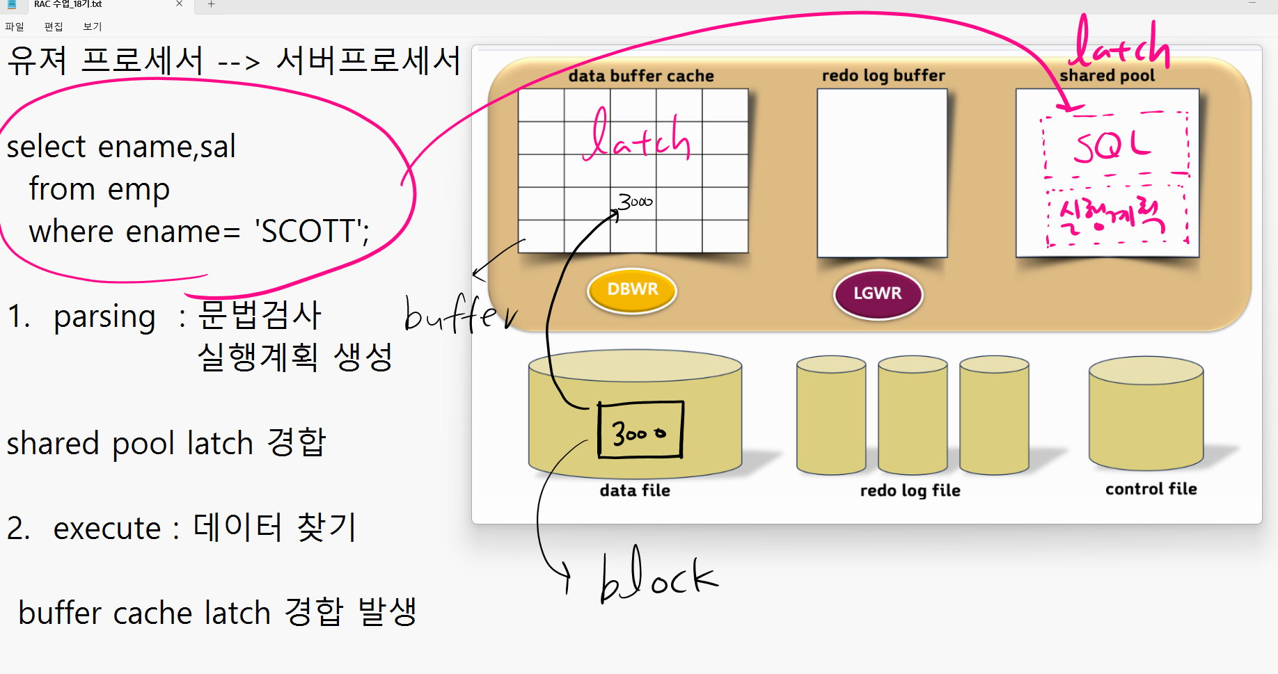 설명: execute 단계에서 scott 의 데이터를 찾는데 메모리에 없으면 data file 에서 찾아서 메모리에 올립니다. 이때 buffer cache latch를 확보해야 올릴 수 있습니다.