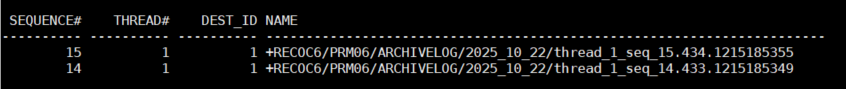 ALTER SYSTEM SET LOG_ARCHIVE_DEST_1 = 'LOCATION=+RECOC6 VALID_FOR=(ALL_LOGFILES,ALL_ROLES) DB_UNIQUE_NAME=prm06';