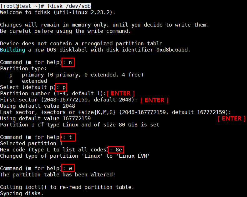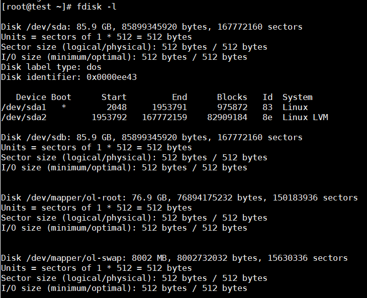 [root@test ~]# fdisk /dev/sdb