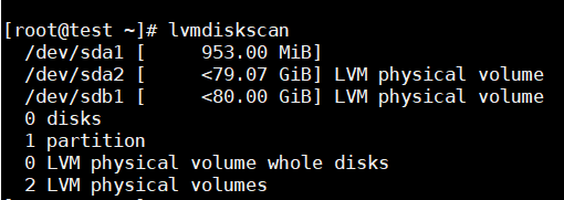 # lvmdiskscan------- 물리 볼륨으로 사용된 블록 장치를 확인