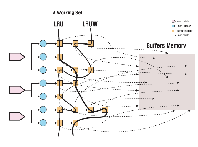 단일 세트의 체인에 너무 많은 블록을 매달아 관리하면, 여러 프로세스가 동시에 체인을 뒤지려 할 때 LRU 래치 경합이 발생한다. 이를 해결하기 위해 오라클은 다음과 같은 방식을 사용한다.