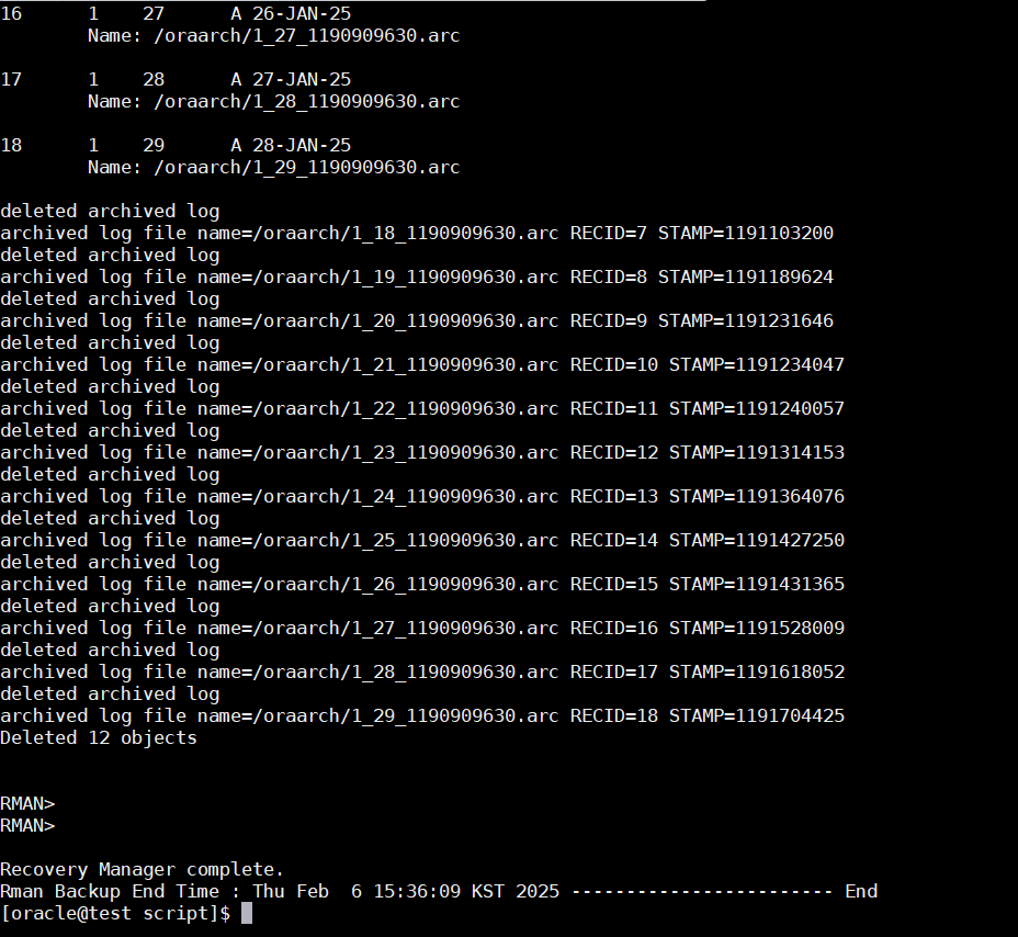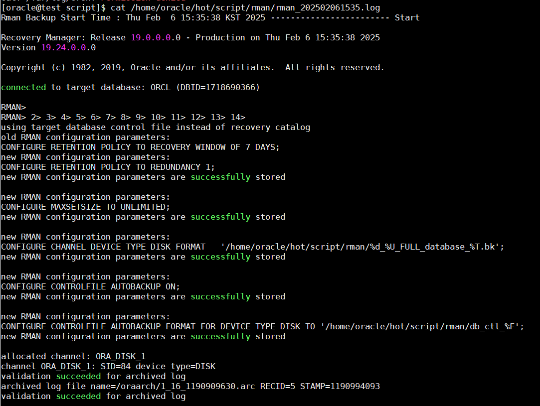 🚀 실행 후 /home/oracle/hot/script/rman/rman_YYYYMMDDHHMM.log 파일이 생성되었는지 확인