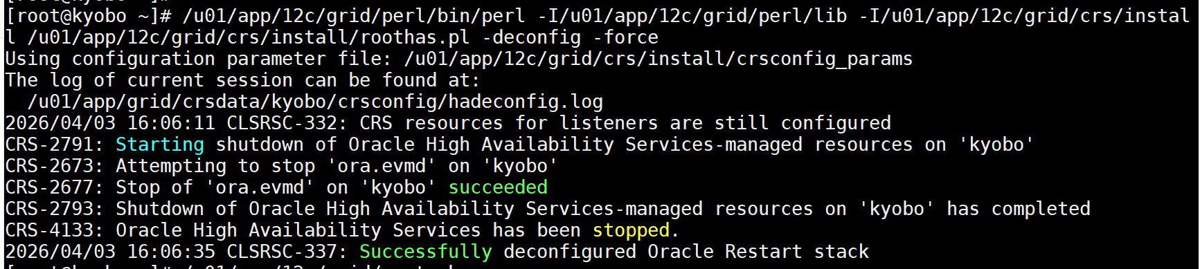 [root@kyobo ~]# /u01/app/12c/grid/perl/bin/perl -I/u01/app/12c/grid/perl/lib -I/u01/app/12c/grid/crs/install /u01/app/12c/grid/crs/install/roothas.pl -deconfig -force