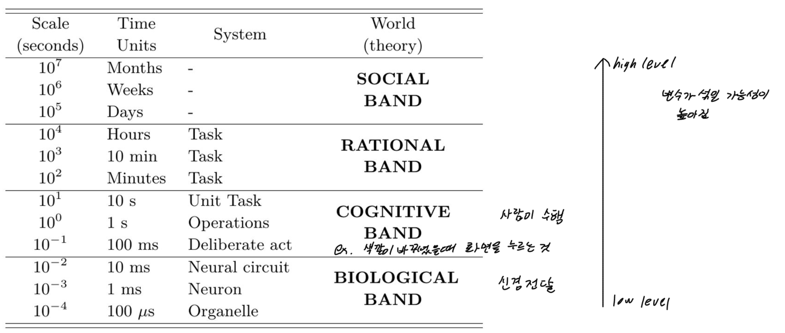 위 그림은 Newell's Time Scale of Human Action을 나타낸 표이다. 이는 사람의 interaction을 측정하는 과정이며, low level부터 high level로 Biological band, Cognitive Band, Rational Band, Social Band가 존재한다. Biological band는 신경 전달 하는 데 걸리는 시간으로 100μs ~ 10ms로 나타난다. Cognitive band는 사람이 수행하는 과정으로 예를 들어 색깔이 바뀌었을 때 화면을 누르는 과정을 포함한다. low level 에서 high level로 갈 수록 scale이 커져 변수가 섞일 가능성이 높아진다.