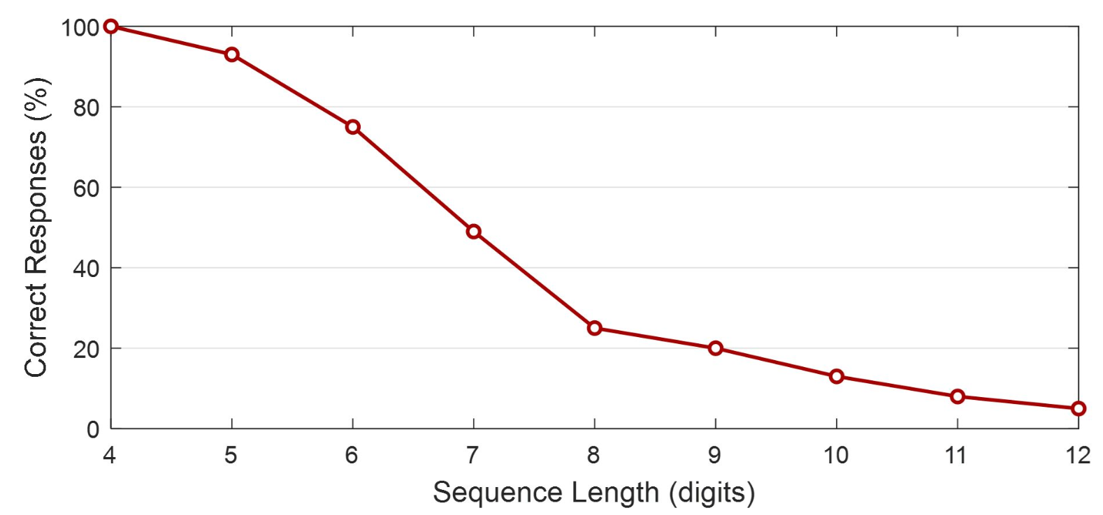 랜덤으로 생성된 숫자 시퀀스를 옮겨적고 점수를 매긴다. 이때 시퀀스는 4에서 13 digits로 되어있다.