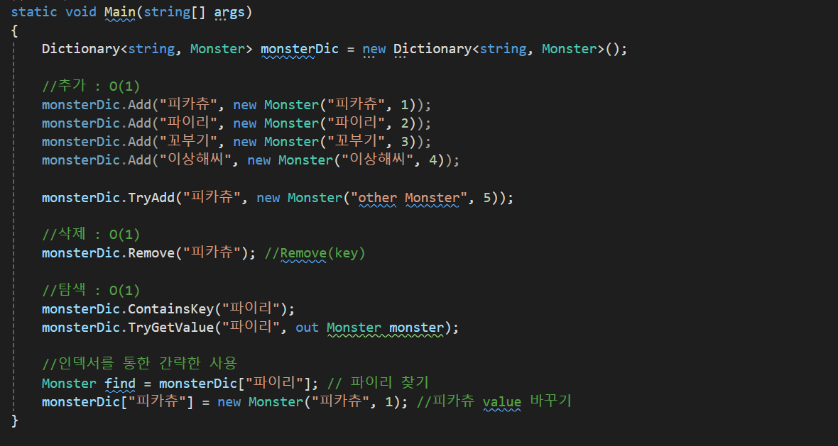 Dictionary에서 제공하는 함수로 Add,TryAdd(시도해서 있으면 바꾸고 없으면 바꾸지 않는함수),Remove(있으면 true를 반환후 삭제 없으면 false). ContainsKey(키가 있으면 찾아주고 없으면 false), TryGetValue(키에 대한 값이 있으면 true 없으면 false)