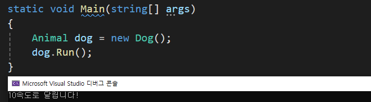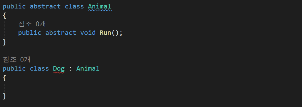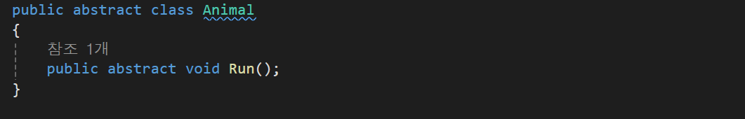 abstract를 선언 후 하위클래스의 함수(Run())의 구체화가 없다면 오류를 일으킨다.