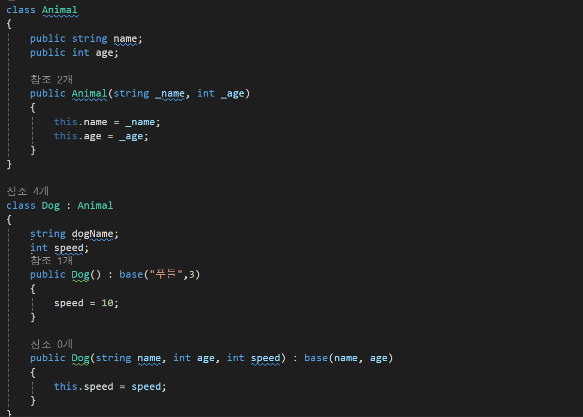 이러한경우 하위생성자에서 같은 매개변수를 입력해줘야한다 이때 사용하는 방식이 base를 이용해 매개변수를 설정해줄 수 있다.