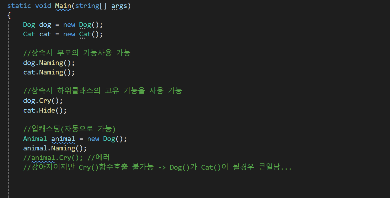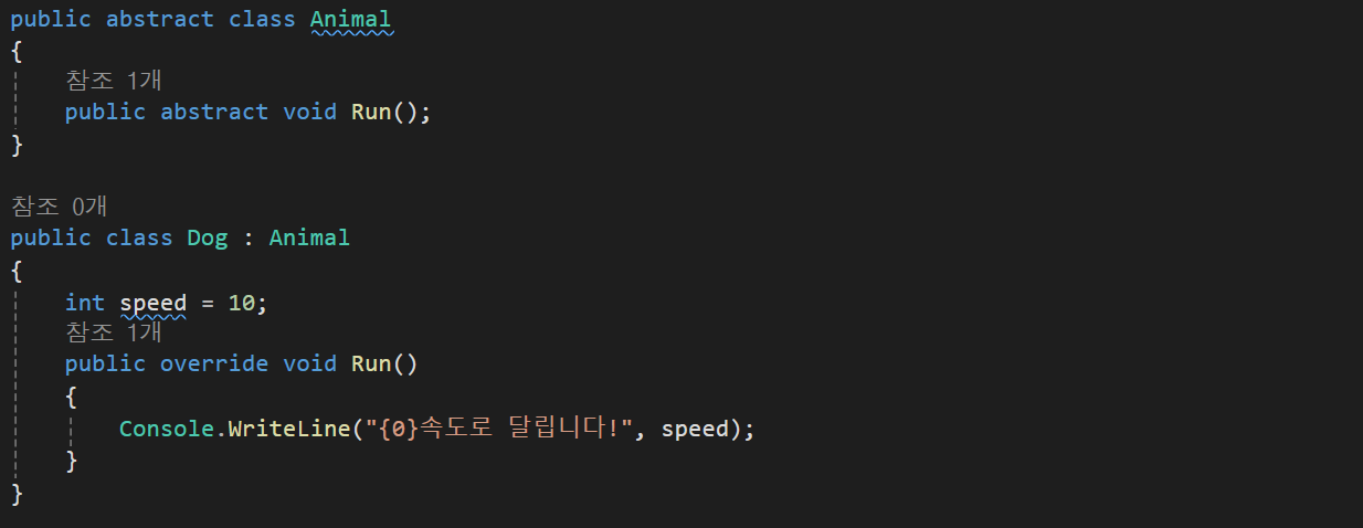 이러한 추상클래스를 사용하는 이유는 코드의 예로 함수가 Run()이 아니라 Cry()로 바꿔서 설명하자면 Animal클래스의 동물들이 우는것을 정의하자기엔 너무 추상적인 경우가 생기기때문에 하위클래스에서 함수를 구체화 하기 위해 사용한다.