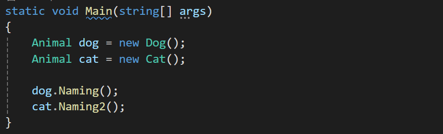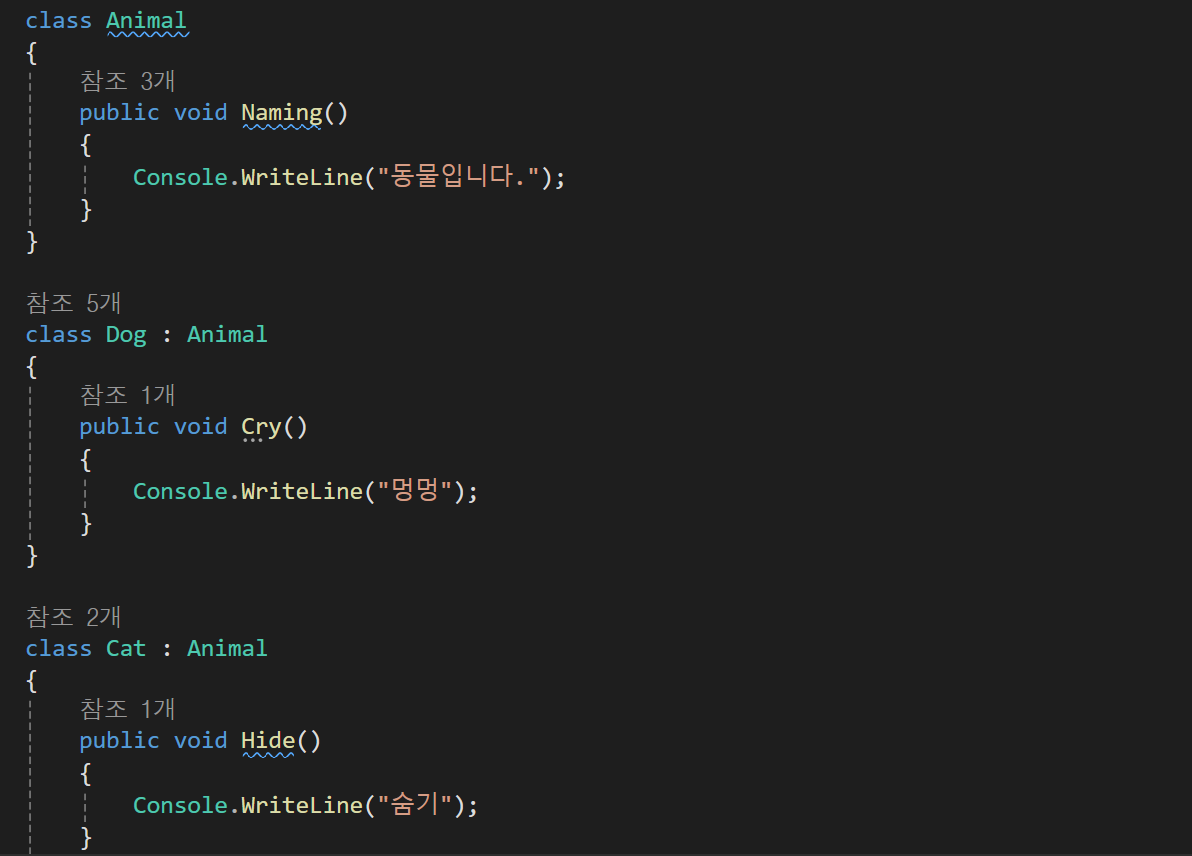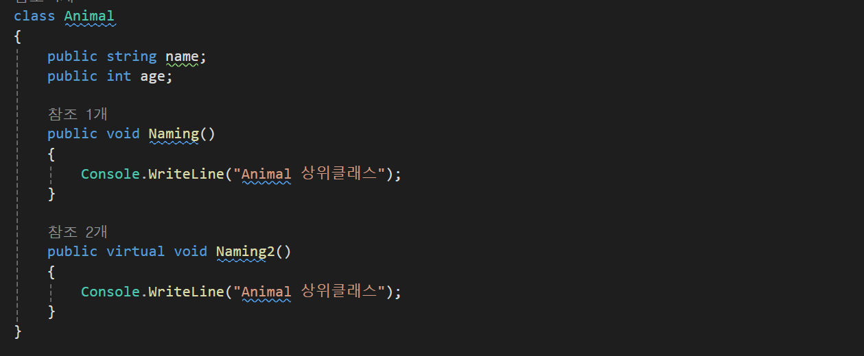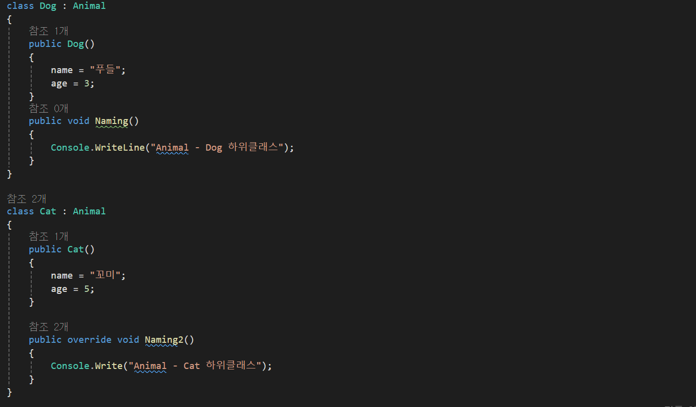 이떄 상위클래스의 함수도 같이 사용하고싶다 한다면 하위클래스의 함수에 base.Naming()이라고 작성한다면 상위,하위클래스의 모든 내용이 출력된다.