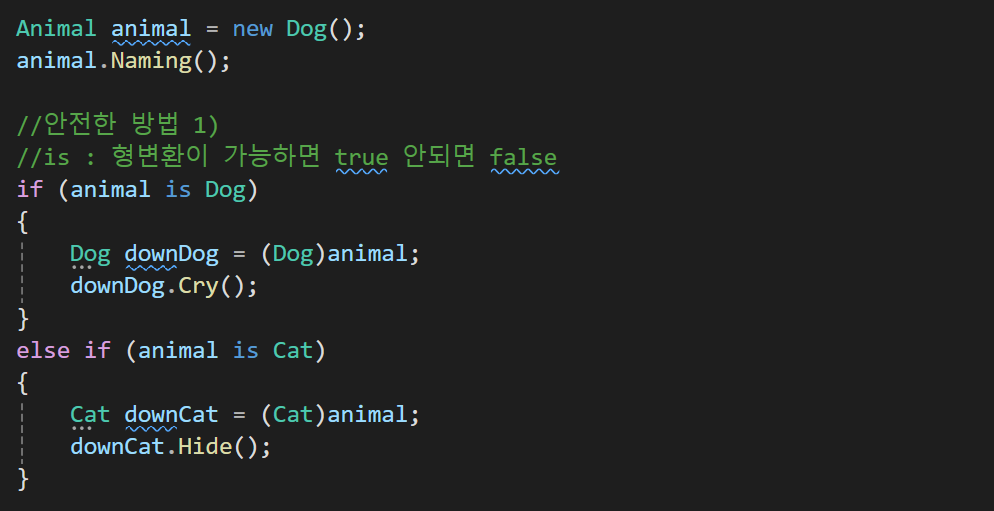 is : if(animal is Dog) -> if(animal은 Dog이면)